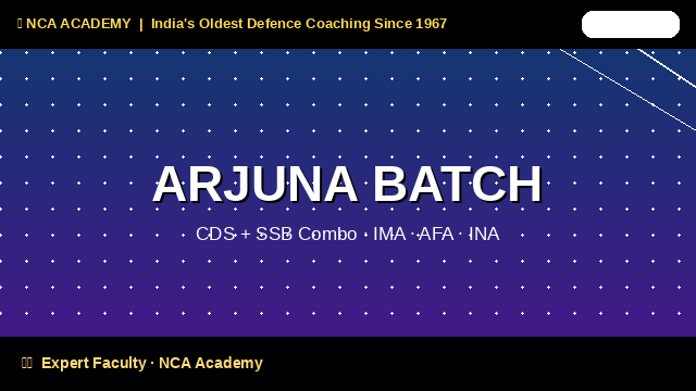 NCA Academy’s ARJUNA BATCH is the complete CDS + SSB Combo programme for graduates targeting IMA, INA, or AFA. This 5-month intensive covers the full CDS written syllabus (English, GK, Elementary Maths) along with comprehensive SSB interview preparation — giving you an end-to-end pathway to a commission.