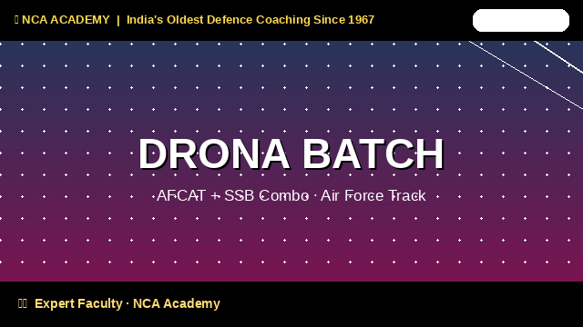 NCA Academy’s DRONA BATCH is the complete AFCAT + SSB preparation programme for aspirants targeting the Indian Air Force. This 4-month intensive covers the full AFCAT written exam (English, GK, Numerical Ability, Reasoning) along with comprehensive AFSB/SSB interview coaching — your complete pathway to flying the Indian skies.