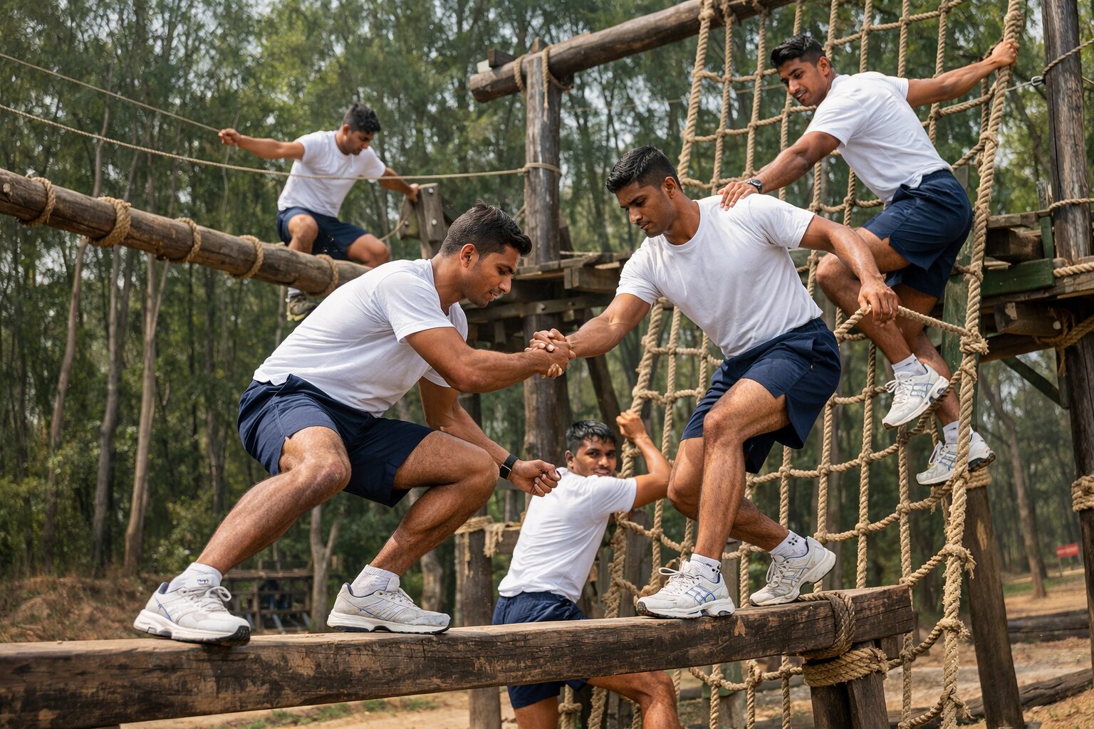 The group must cross obstacles using limited resources (a plank, rope, balli, etc.) without touching the “out of bounds” areas. Obstacles increase in difficulty progressively. Key tip: Take initiative early, help teammates, keep the group moving. Leadership here is measured, not just activity.
